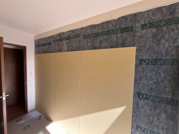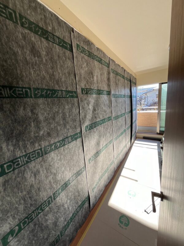 通常は石膏ボードに壁紙を貼る仕上げでも充分なのですが、今回はプラスαで防音効果も加えました。
