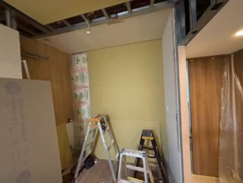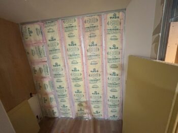 リビングと接している造作壁には、防音性を高めるためにグラスウールと石膏ボードを両面二層張りしました。